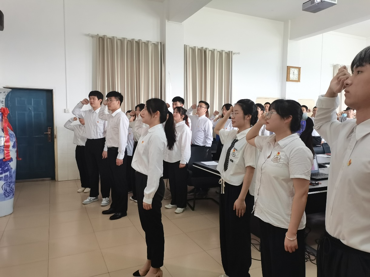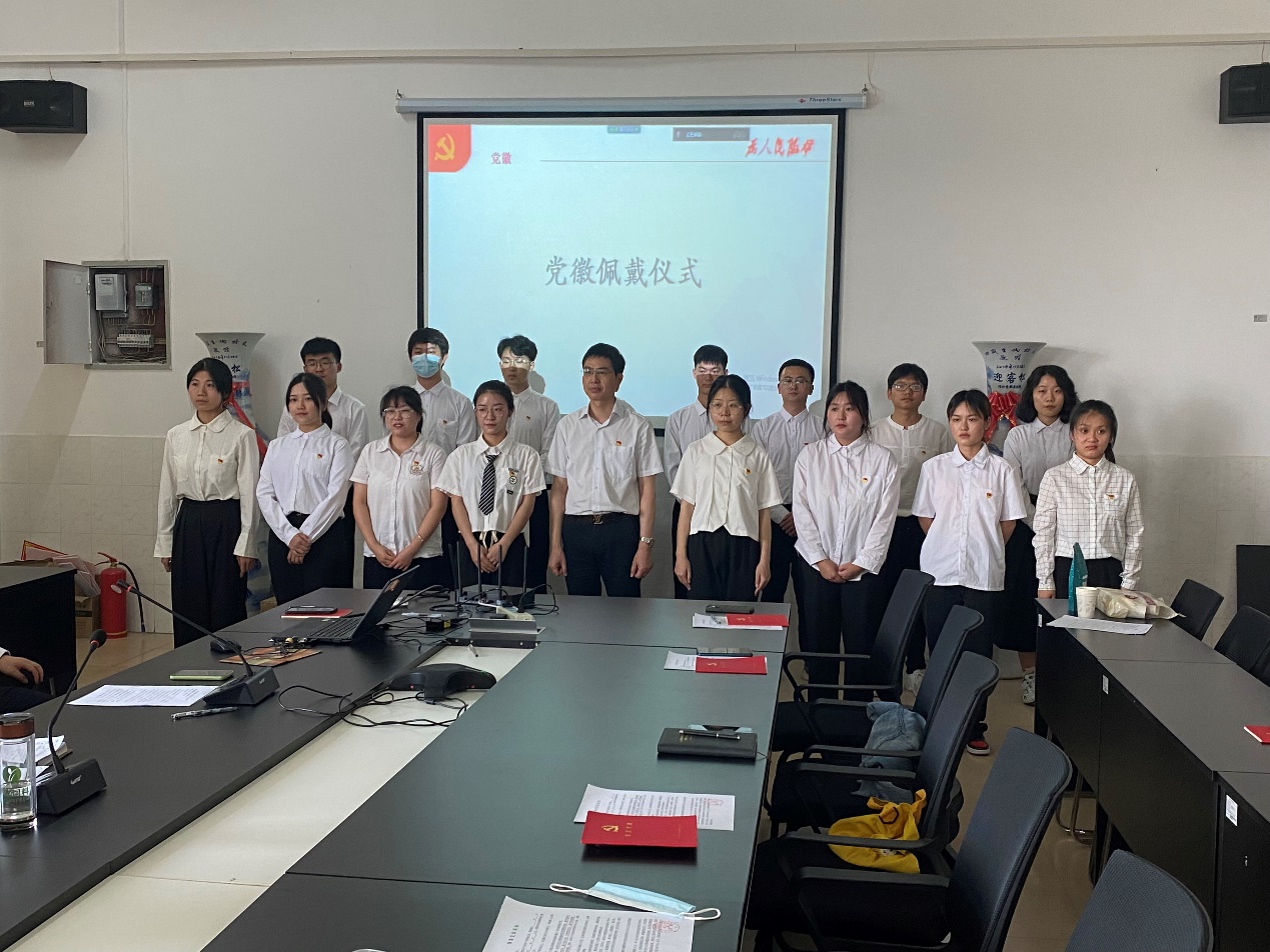 本次活动共有两个议程,第一项是新增预备党员党员徽章佩戴仪式。议程在合唱国际歌中拉开帷幕,先由苏晓云为18名新增预备党员发表祝词,在祝贺预备党员们加入中国共产党后,发表寄语:“作为一名学生党员要有奉献的愿望和精神,只有奉献工作,奉献集体,奉献社会,人生才有价值”。同时,她希望预备党员们不忘入党初心,时刻为党组织奉献一切。接下来是党员徽章佩戴仪式,由熊新山书记为预备党员们佩戴党员徽章,并对着党旗宣誓。预备党员们神情坚毅,宣誓时铿锵有力。