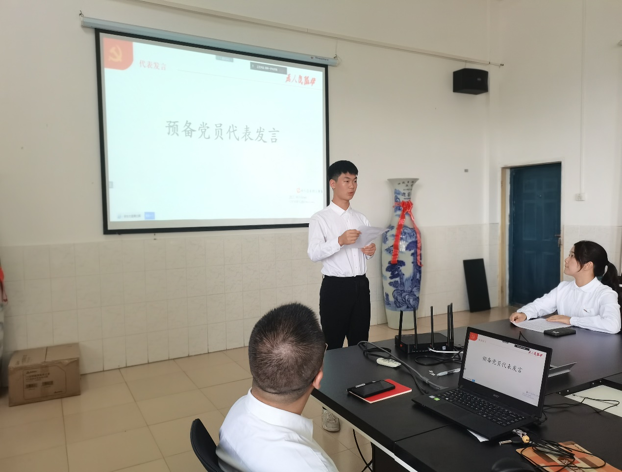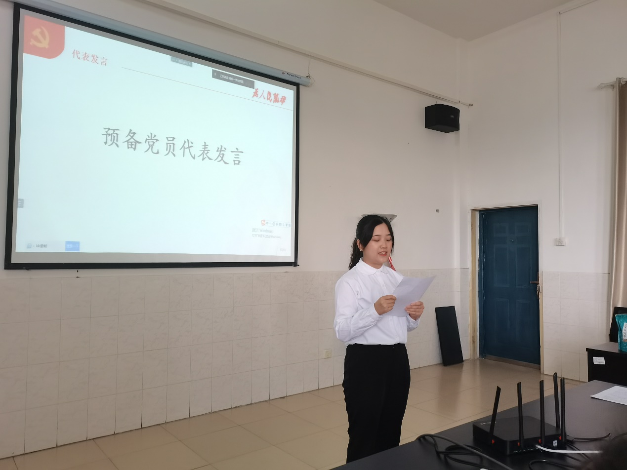 宣誓结束后,预备党员们代表发言表决心。首先是研究生代表田群芝,她从自身经历出发,讲述自己亲眼目睹了党员在抗疫过程中发挥先锋模范作用,从他们身上深深感受到了敢为人先的精神,更加深刻体会到一名党员的义务和责任,同时以此代表研究生预备党员表态:思想上牢记入党誓词,自觉加强理论学习;学习上加强专业学习,弘扬创新精神,做到不辜负党和人民、不辜负社会。其次是本科生代表邓翰源,他首先表达了自己的激动之情,同时他也说到“加入党组织,仅仅是一个共产党人万里长征迈出的第一步”。为了践行入党誓言,他代表本科生预备党员在此表决心:思想上加强党的理论学习,同时向老党员同志学习、请教;学习上用专业知识武装自己,最终投身到祖国和人民需要的地方去;生活中团结带领同学,同时作为老师们的得力助手,积极分担院里的事务,将共产党员的先进性以实际行动体现在生活、工作等方方面面。他们的发言赢得台下党员的阵阵掌声。