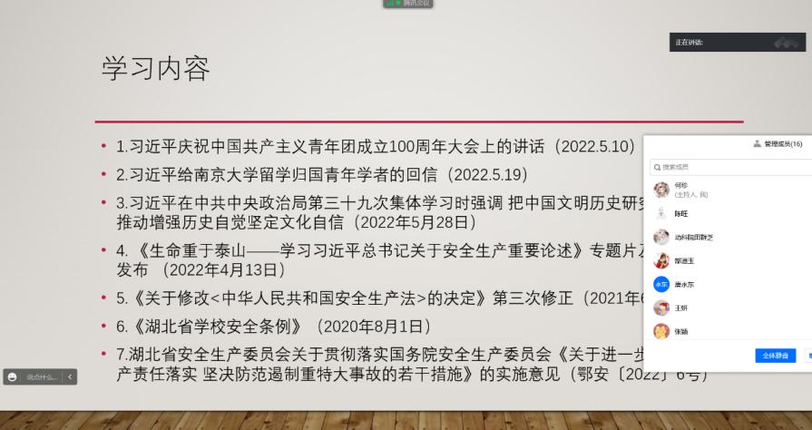 本次会议一共分为七项学习内容:学习习近平在庆祝中国共产主义青年团成立100周年大会上的讲话、习近平给南京大学留学归国青年学者的回信、习近平在中共中央政治局第三十九次集体学习时强调:“把中国文明历史研究引向深入,推动增强历史自觉坚定文化自信”、《生命重于泰山——学习习近平总书记关于安全生产重要论述》专题片及解说词全文发布、《关于修改<中华人民共和国安全生产法>的决定》第三次修正、《湖北省学校安全条例》以及湖北省安全生产委员会关于贯彻落实国务院安全生产委员会《关于进一步强化安全生产责任落实 坚决防范遏制重特大事故的若干措施》的实施意见。文化自信是一个国家最基本、最深沉、最持久的力量,每个人都要从现在开始做好文化自信的传播者、弘扬者,才能克服前进路上的艰难险阻,激发发展创新的活力,推动实现中华民族伟大复兴。
