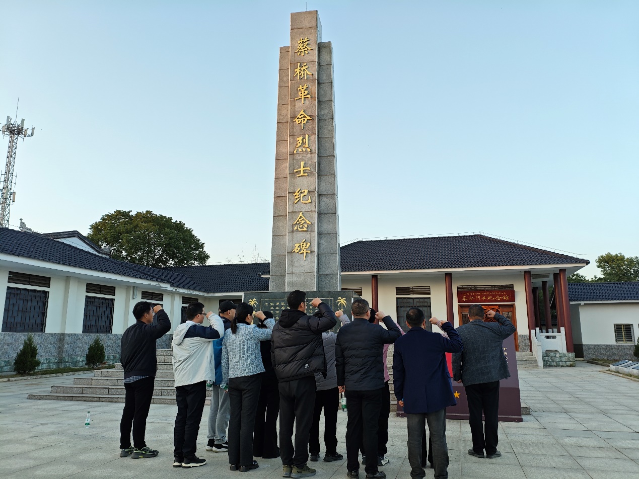 活动结束后,水产系党支部的教职工继续他们的红色教育之旅,前往了荆州区马山镇蔡桥村的排蔡桥革命烈士纪念园。这里是荆州市爱国主义教育基地,始建于1968年,为了纪念1928年至1943年期间在蔡桥开展革命活动中牺牲的革命先烈。纪念园内静谧安宁,四周草地的石碑上记录着革命英雄事迹简介,园正中是一座高7米的纪念碑,主要是纪念那些在革命斗争中牺牲的先烈。碑身基座刻录着21名革命烈士的姓名,其中包括了在1930年至1942年期间为革命牺牲的同志。