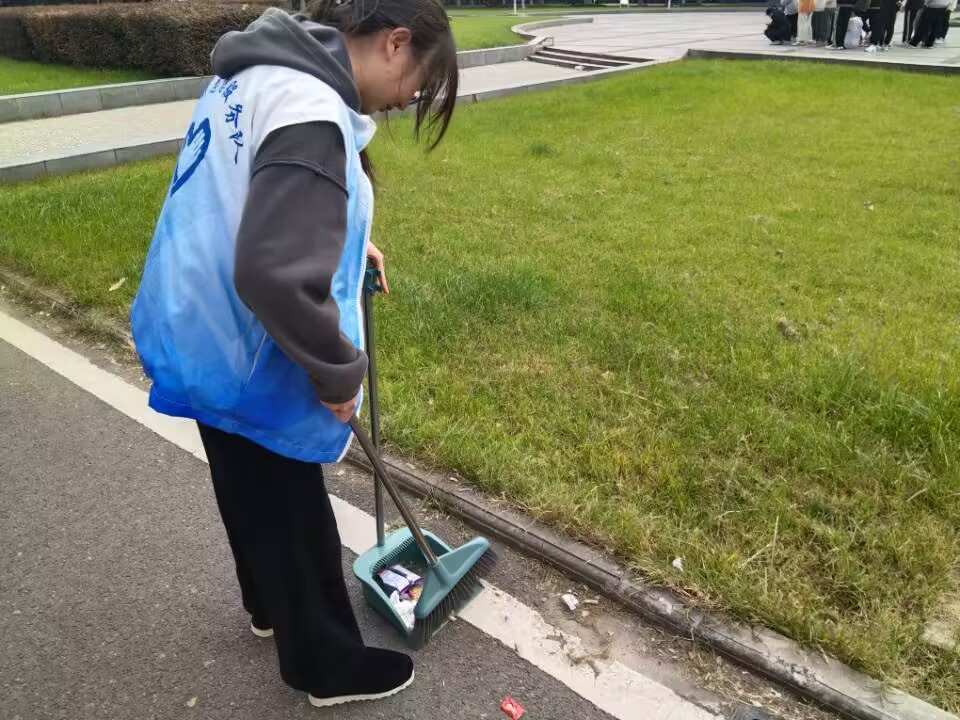 在活动负责人樊世绅的带领下,志愿者们拿着扫帚、簸箕等工具,仔细地清理街道 、草丛等地。大家充分发扬“不怕苦、不怕累、不怕脏”精神,经过两个多小时的劳作,五号教学楼周边环境焕然一新。