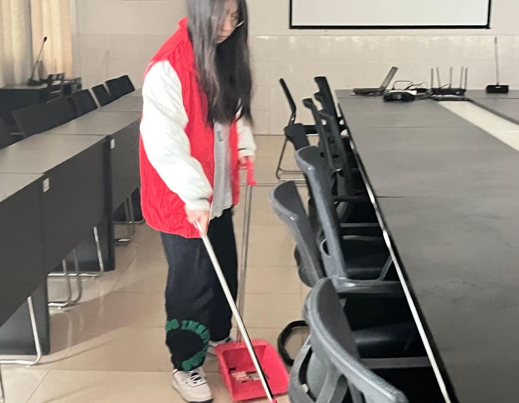 在整个实践劳动过程中,各小组带着清洁工具前往各自区域,擦拭会议室内的桌面,清扫地面以及室内的各个角落。每位同学都热情满满,积极响应学院号召,挥洒汗水,为整洁明亮的环境进行辛勤劳动。活动结束后,同学们将垃圾装运丢至垃圾桶,并将清扫工具放至原处。对焕然一新的会议室,每个人的脸上也都露出了笑容。