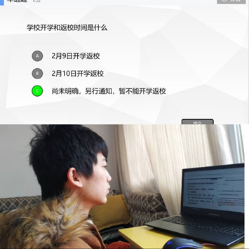 “自新型冠状病毒感染的肺炎疫情发生以来,作为疫情防控的重中之重的湖北省面临了极大的考验与挑战,目前的疫情形势依然十分严峻” 在为同学们详细介绍了疫情最新进展之后,李鹏老师重点强调了目前国家和学校针对疫情的具体举措,并通过在线测试的方式强调目前学生返校时间尚未确定,所有学生一律不准返校,但学校将于2月10日通过在线学习的方式全面启动新学期教学工作,同学们务必做好相关准备。