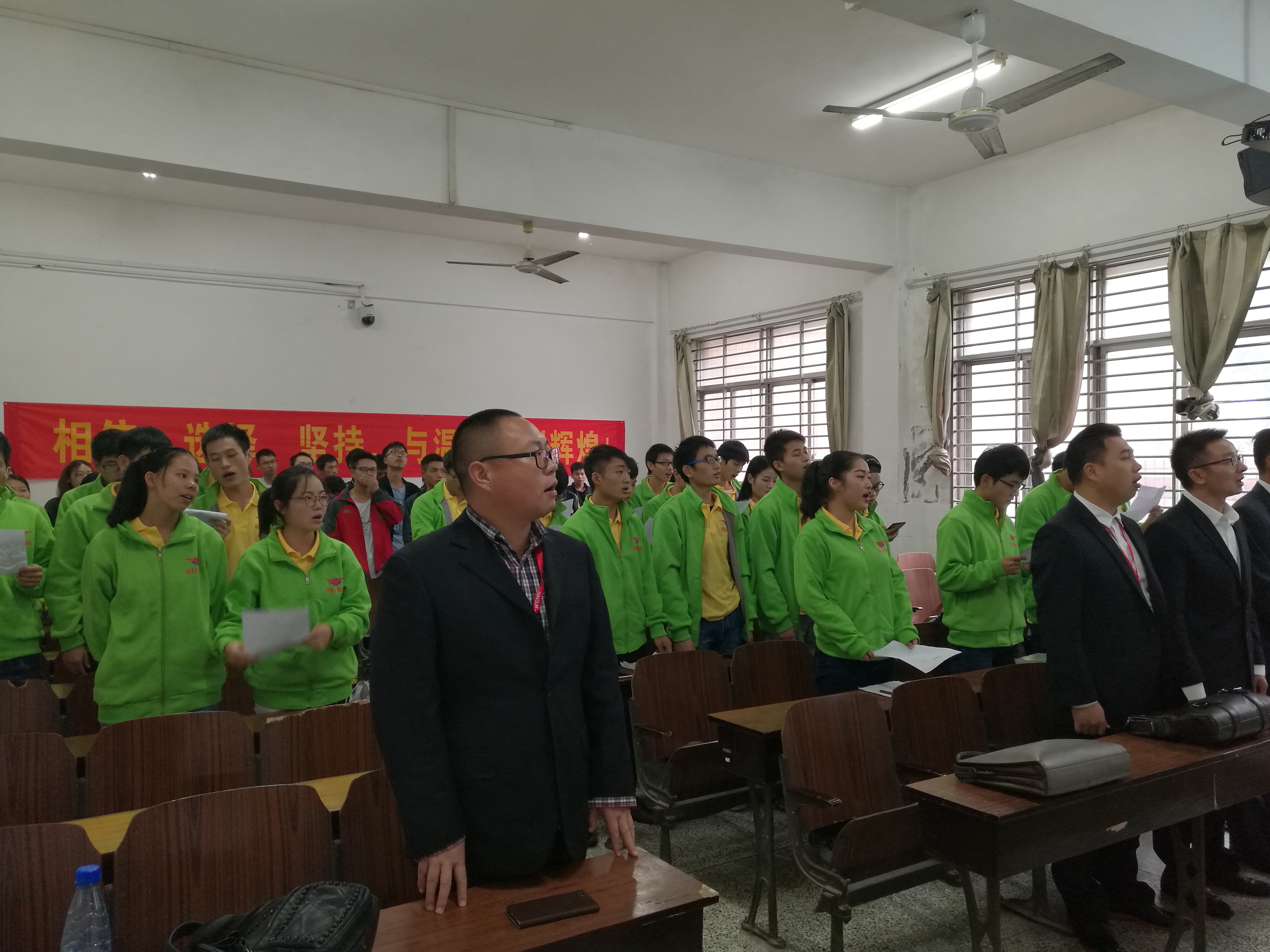 开班典礼前在教室循环播放温氏集团宣传片。典礼伊始,全体成员起立合唱温氏之歌。