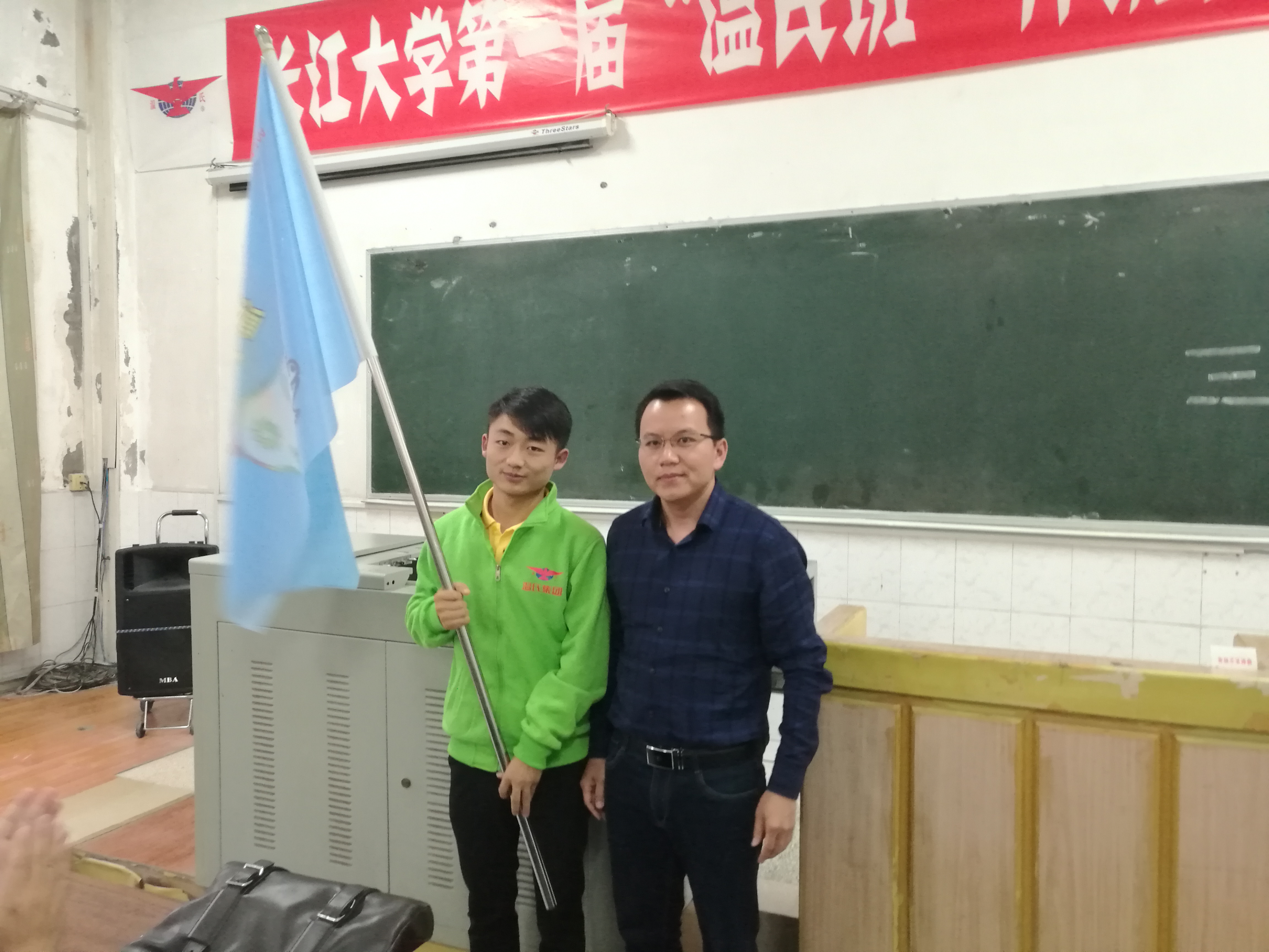 温氏技术总监梁敏向温氏班授旗,本届温氏班班长黄炎海代表本届温氏班接旗。