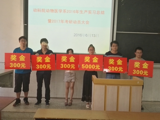 汪招雄博士首先解读了我校关于大四学生推免研究生的相关政策和开云官网对参加研究生考试以及获得研究生入学资格的奖励政策,然后宣读了动医动药专业2016年考研的10名学生表彰名单(张小婷、蔡萌、周晶谦、李端端、徐闰、王咏、王彪雄、文继锋、黄安雄、张友),许巧情副院长向优秀研究生代表颁发了奖励,同时对这些同学提出希冀,望再接再厉,积极进取。之后,许巧情副院长发表动员讲话,她给学生提出了16个字:耐心分析,量力而为,认真备考,坚持到底。并与同学们分享备考经验指出要坚定决心,相信自己,在学习过程中要甘于寂寞,建立良好的团队学习模式。在学习的同时还要劳逸结合。介绍了开云官网研究生设有国家奖学金、助学金、以及学业奖学金。报考开云kaiyun官方网站的研究生的奖学金覆盖率达100%,平均每人每年可领取8000元,考生不用为学费而担心。