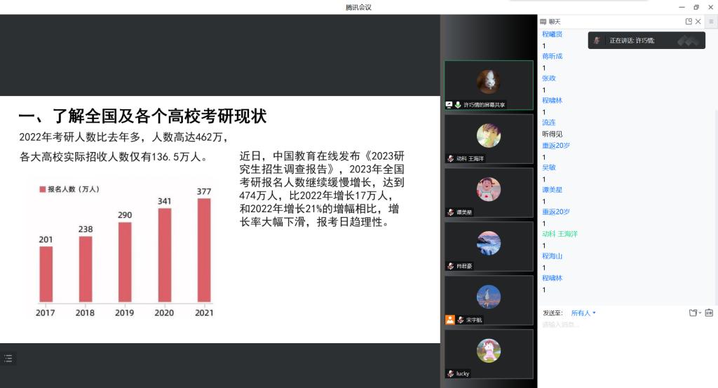 针对考试复试过程中老师问什么?学生怎样有技巧性回答?如何联系心仪导师?…许巧情从当前学生考研报考现状、了解自身优势及报考学校要求、认准目标坚持不懈这三方面进行了详细的讲解,并就学生关心的问题进行线上解答。