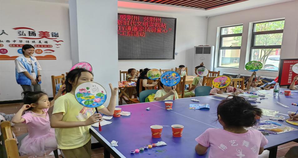 上午九点,团队准时到达太东社区,并与社区工作人员迅速对接,顺利开展了“莲华宫扇DIY清廉家风润童心”手工扇绘制活动。为迅速拉近与孩子们的距离,活动伊始,队员们以独具特色的代称和各自擅长的技能来自我介绍,并鼓励孩子们也做自我介绍。在队员们耐心的引导下,“破冰”行动顺利完成,初次见面的陌生感逐渐消散,取而代之的是温馨与欢乐的氛围。