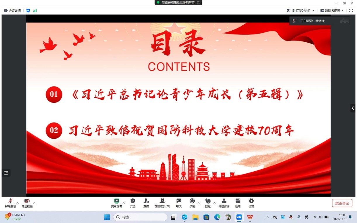 学习科创部徐继婷同学,通过视频和PPT的形式,从习总书论青少年成长和致信国防科技大学建校70周年两项内容向同学们分享了自己学“习”工程的心得感悟。“教育是民族振兴、社会进步的重要基石。”青年一代应当坚定信仰守初心、学懂弄通秉真心、守正创新铸匠心、知行合一砺恒心,在讲好新思想、传播新理论中发出青年之声、讲出青年味道、贡献青年力量,成为推动党的创新理论“飞入寻常百姓家”的“堂前燕”。