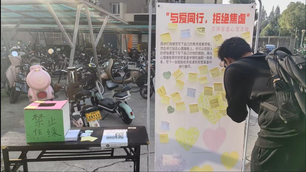 在活动现场,许多同学在便签上写下自己的焦虑或者烦恼,如:“不想多愁善感”、“希望顺利毕业”、“病魔快走”,贴在展板上,并在安慰盲盒中抽取便条。也有同学,对展板上的问题进行了回答,写下“安慰便条”投进了盲盒中。