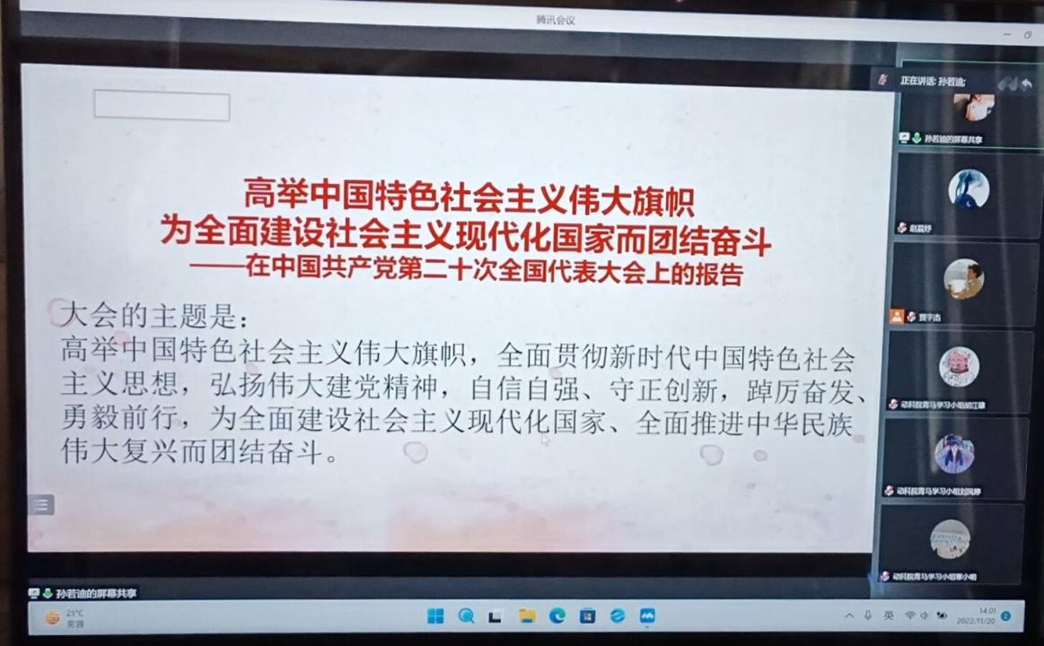(通讯员:赵晨妤)为深入学习习近平总书记在党的二十大的重要讲话,2022年11月20日下午两点,动科院以线上形式举行此次活动。参加活动的有院青马小组与院学习科创部全体成员,本次活动由学习科创部孙若迪担任主讲。
