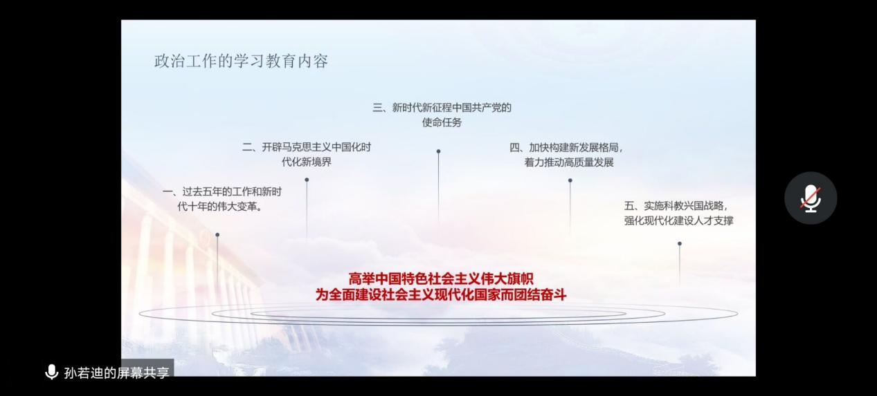 本次会议内容分为对大会主题的介绍和对政治工作重要内容的学习两部分。首先孙若迪同学为大家介绍了大会的主题:“高举中国特色社会主义伟大旗帜,全面贯彻新时代中国特色社会主义思想,弘扬伟大建党精神,自信自强、守正创新,砥砺奋发、勇毅前行,为全面建设社会主义现代化国家、全面推进中华民族伟大复兴而团结奋斗”。接着详细的介绍了政治工作学习的十五个重要内容,让同学们对于此项工作有了更加深刻的了解。