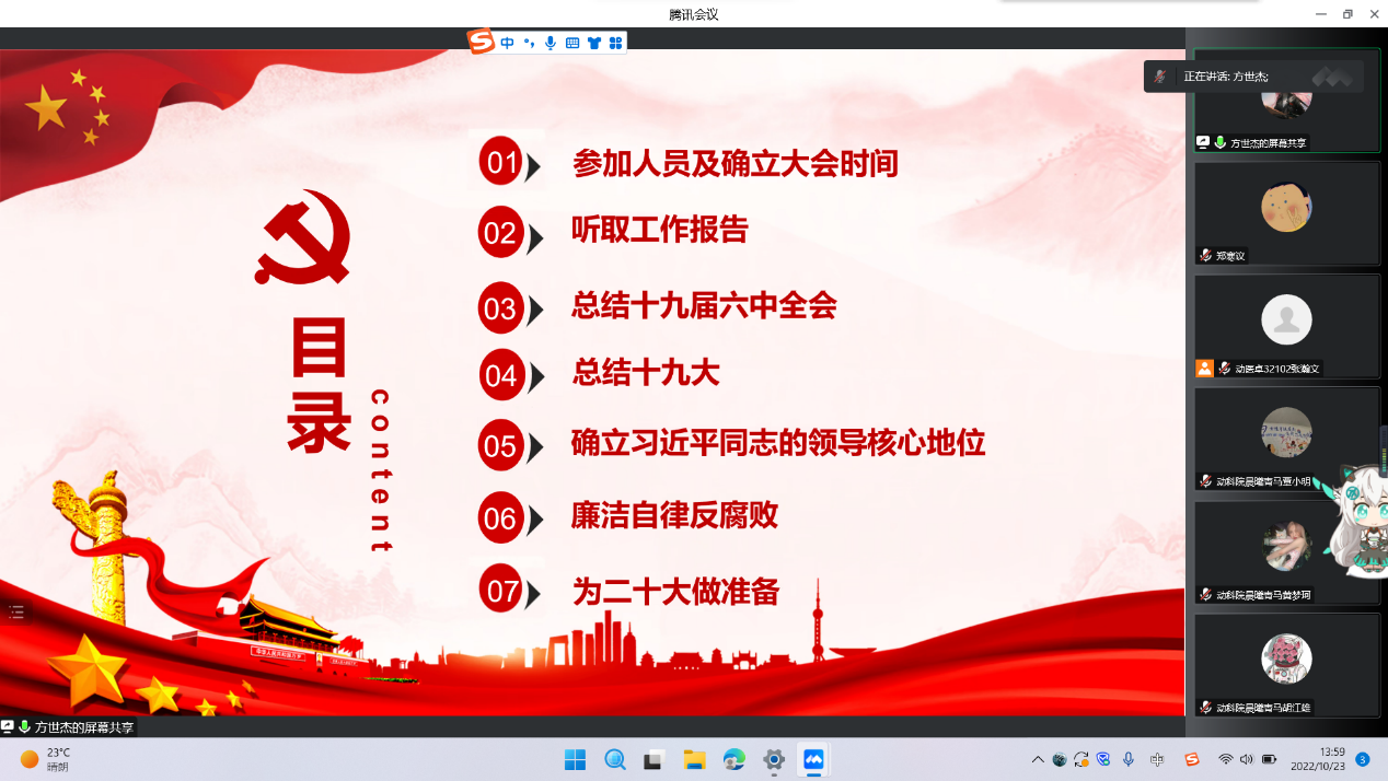 本次活动的学习内容分为了解参加人员及确立大会时间、听取工作报告、总结十九届六中全会等七个部分。方世杰首先带领大家了解了参与会议的人员和工作报告的相关内容。对于会议中十九届六中全会和十九大工作的总结内容中,大家学习到全会充分肯定了党的十九届六中全会以来中央政治局的工作,高举中国特色社会主义伟大旗帜,并隆重庆祝了中国共产党成立100周年、中华人民共和国成立70周年,同时还制定了第三个历史会议,在全党开展党史学习教育,号召全党学习和践行伟大建党精神。