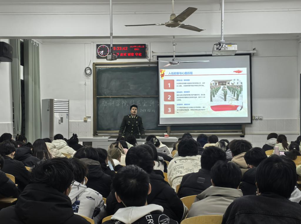 为深入学习贯彻党的二十大精神和习近平总书记关于国防和军队建设的重要论述,加强高校国防教育,激发大学生爱国热情,12月11日,动科学院成功举办了征兵宣讲活动。此次活动旨在鼓励广大学生积极响应国家征兵号召,投身军营,报效祖国。