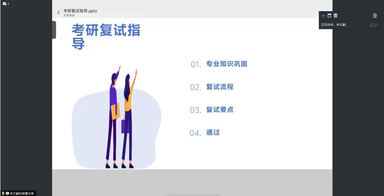 交流会上,董天舒、闫丫丫等研究生通过精心准备的PPT,系统讲解了复试流程、面试技巧、材料准备及心态调整四大核心模块。董天舒结合自身经历,强调“提前模拟面试”的必要性,建议考生通过录制视频复盘表达逻辑与仪态。闫丫丫针对“专业问答”环节提出“三步法”:梳理核心知识点、关联科研热点、总结个人见解,帮助考生构建系统性应答框架。高依恒与来文豪则聚焦PPT汇报要点,强调“内容精炼、逻辑清晰、突出科研潜力”,并分享了用图表展示实验成果的技巧。周华骏通过案例分析,鼓励考生“扬长避短”,将本科经历与报考方向深度融合,展现综合素养。辅导员杨湘虹从心理调适角度补充道:“复试是能力与心态的双重考验,考生需避免过度焦虑,可通过正念练习、模拟场景脱敏等方式增强自信。”