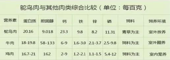 鸵鸟肉因为其超高的营养价值被国外营养专家称为肉中红宝石,中国著名的营养学家、陈云的夫人于若木老先生曾经为鸵鸟肉题词——鸵鸟肉乃肉中精品。鸵鸟肉的营养价值简单地说来就是四个字——五高三低:高蛋白、高钙、高铁、高锌、高硒、低胆固醇、低脂肪、低热量。详细解释一下就是,高蛋白,有利于肌肉骨骼生长;高钙,有利于骨骼生长;高铁,有利于免疫力提升;高锌,有利于皮肤健康;高硒,有利于保持身体的年轻态;也就是说,鸵鸟肉有利于儿童生长发育,有利于老年人健康长寿,有利于女士皮肤年轻态,有利于男士肌肉健壮。而且,低脂肪、低热量、低胆固醇三大特点,还能使人们保持苗条身材,不会有任何的健康风险。拿常见的肉类做对比的话,它的综合营养价值是牛肉的四倍。