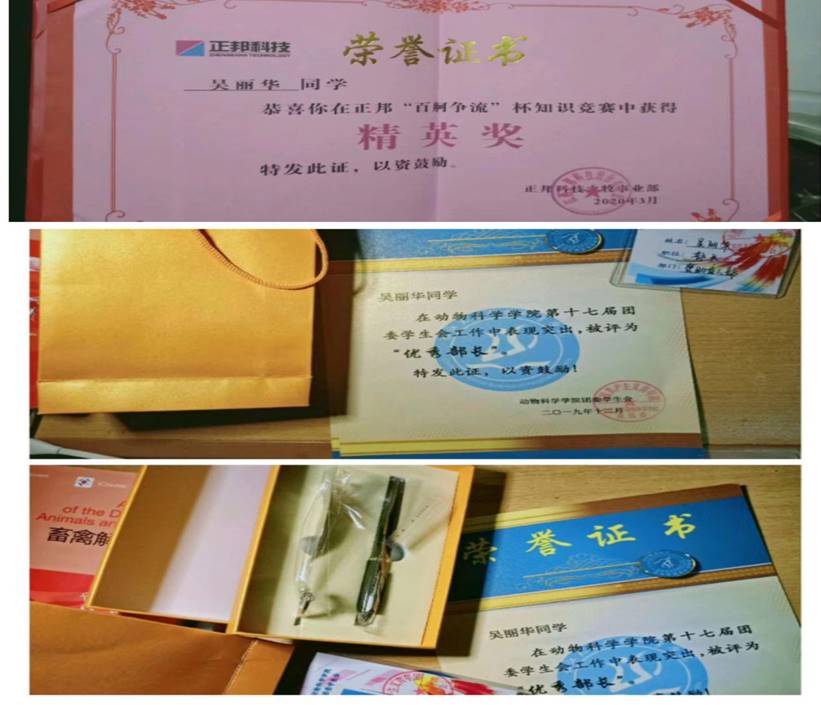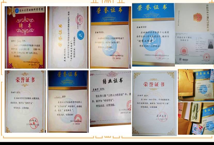在班级中,认真履行做班干部的职责,创建班Q,不定期地推送复习资料、班级及社会讯息、主题班会或团会新闻稿,同时负责每周带领班上同学一起完成青年大学习。荣获“优秀学生干部”。