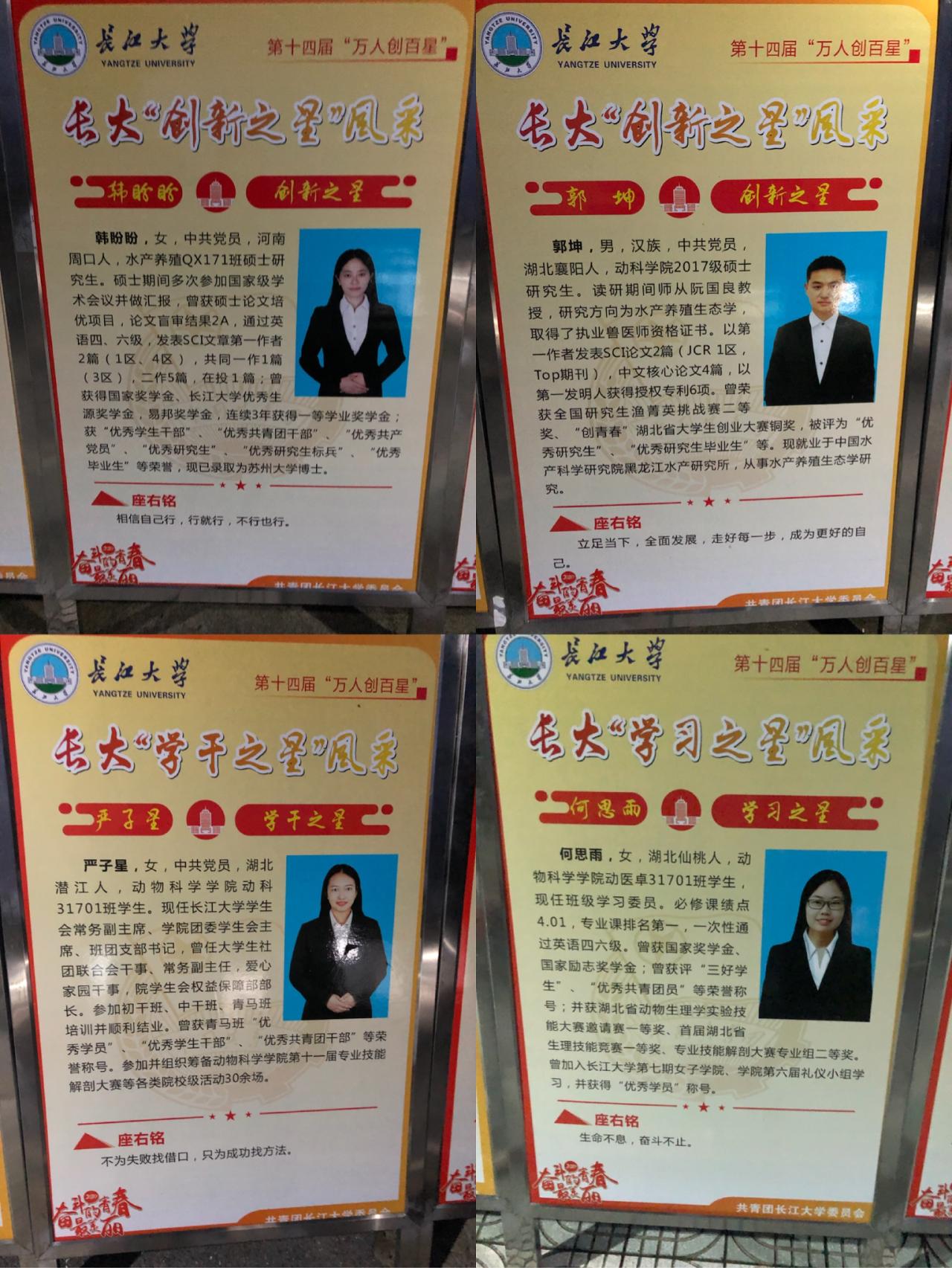 (通讯员 鲁文明)建功新时代,奋斗做先锋。为了深入推进“三全育人”,引领青年大学生树立远大理想全面发展个性特长,争做情操高尚、身心健康、学业优秀、特长鲜明的新时代大学生,经广泛宣传、个人自愿申报、学院认真审批和学校团委严格筛选,开云官网4名同学开云kaiyun官方网站第十四届(2020“万人创百星”活动中脱颖而出,荣获“长大之星”荣誉称号,分别是动医卓31701班何思雨获得“学习之星”、动科31701班的严子星获得“学干之星”、水产养殖QX171班硕士研究生韩盼盼获得“创新之星”、2017级硕士研究生郭坤获得“创新之星”。
