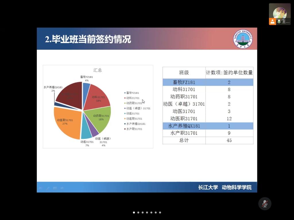 会上王海洋老师就学院当前各班就业情况进行了全面分析,并通过PPT为参会学生详细讲解了网上电子签约系统学生端、用人单位端操作说明,强调三方协议的重要性和相关注意事项、离校前后应做事宜,并针对考研学生后续毕业工作注意事项进行了说明。随后重点就近期2021年全军面向社会公开招考文职人员、湖北省2021年事业单位招考公告(省直、各地事业单位)、湖北省2021年中小学教师公开招聘备考指导三个考试的报名时间节点、考试注意事项、学校线下培训地点等进行了详细的说明,号召预毕业生们认清就业形势,把握就业机会,拓展就业思路,树立正确就业观念,积极准备。最后王海洋就学生在外实习期间自身安全健康情况、每天签到、青年大学习等事项进行了说明。