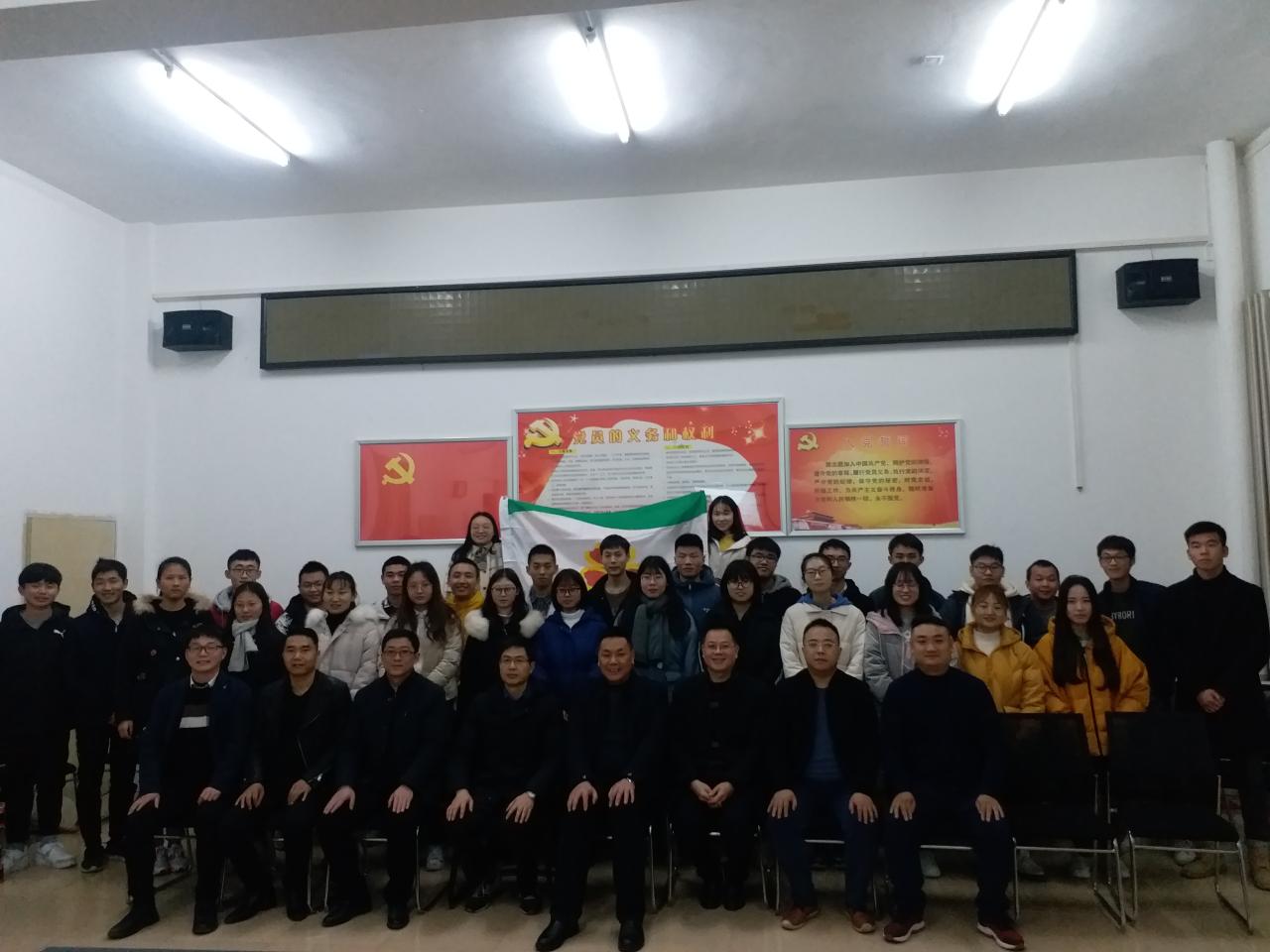 随后由班长杨艳林作学生代表发言,张必军总裁进行授旗仪式,与班委完成交接后全体参会人员合影。