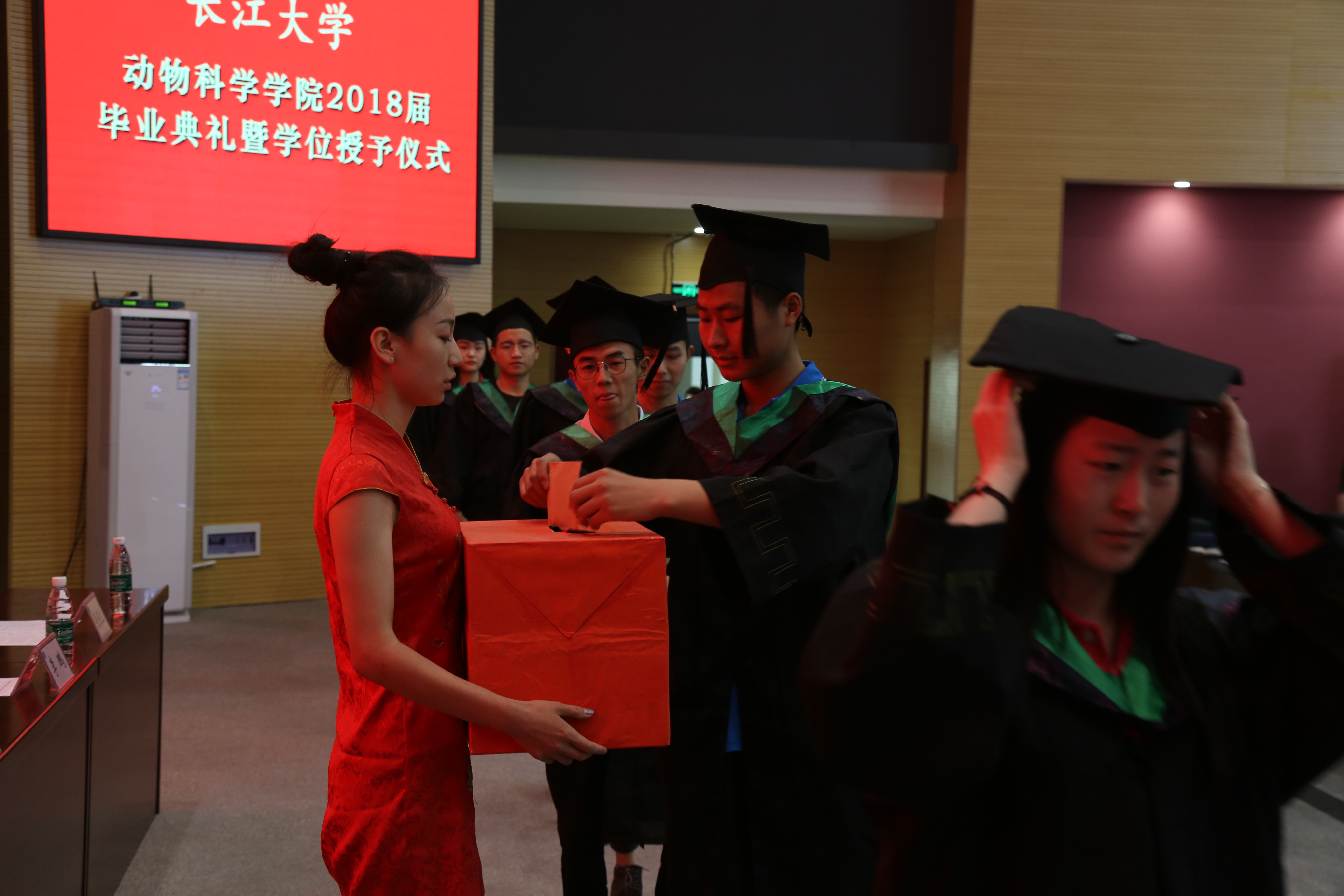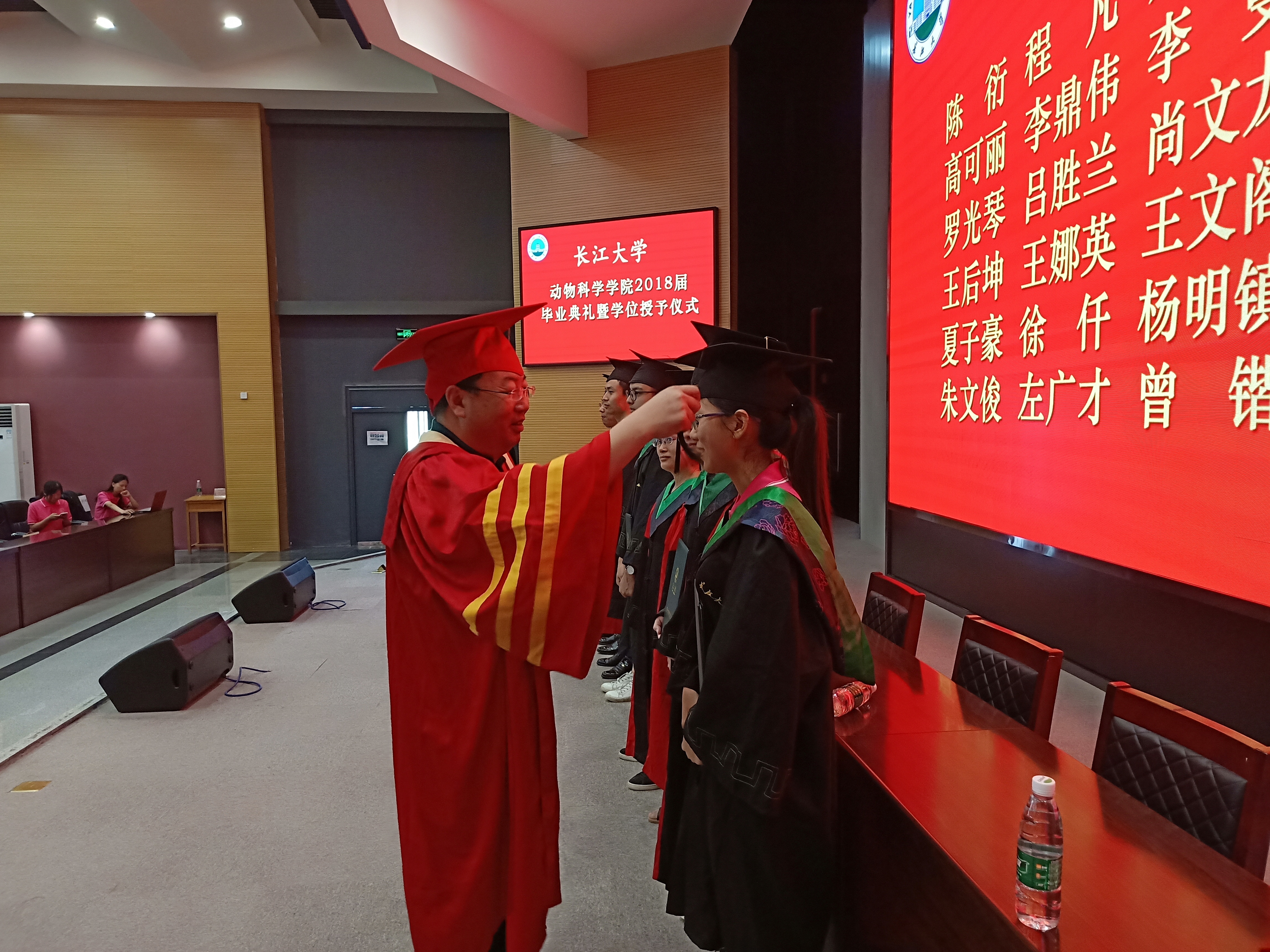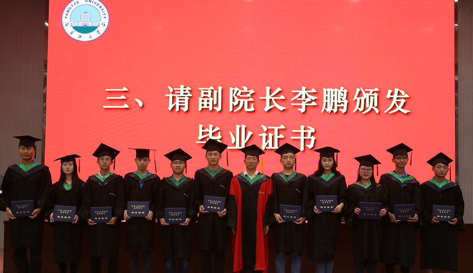 上午9时许,全体毕业生起立,唱国歌,毕业典礼在雄壮的国歌声中拉开帷幕。首先,党委书记曾庆军宣读文件, 55位优秀毕业生受到表彰,副院长李鹏为2018届毕业生代表颁发毕业证书。