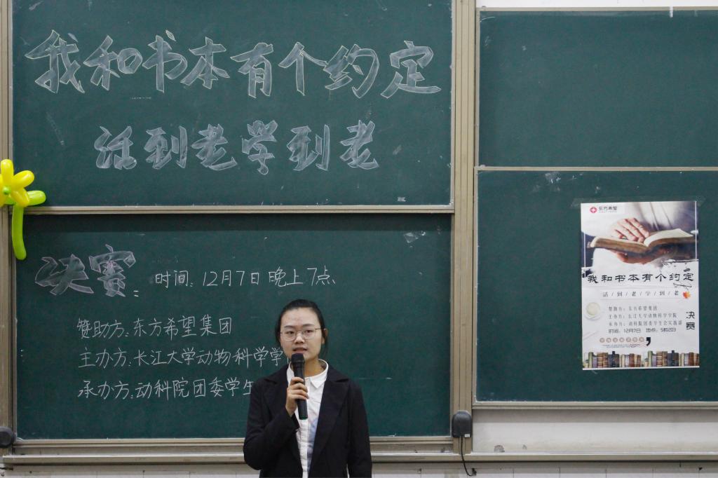 (通讯员/柯婷婷 摄影/李月华)为培养大学生的阅读习惯,丰富大学生的课余生活,提高大学生的表达能力,宣传倡导“读书好,好读书,读好书”的优良风气,动物科学学院于12月7日举办了“我和书本有个约定”活动的决赛。本次活动由东方希望集团赞助,动物科学学院团委学生会实践部承办。莅临本次决赛现场的嘉宾有动物科学学院团委书记杨湘虹、18级辅导员王海洋,教育学院辅导员任雯婷,电信学院辅导员王齐禄以及农学院辅导员万钰。评委有动物科学学院团委学生会主席周锦,园艺园林学生会主席华苗峰,女子学院学生辅导员刘秀珍以及演讲与辩论协会西区会长陈香武。
