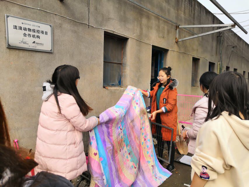 到达基地,看到那些无助可怜的小猫小狗,志愿者们都很心疼,忍不住将它们抱在怀里给予它们温暖。接着经过工作人员的快速分工,22名志愿者也迅速进入了工作状态:有的拿着扫帚清扫着路上的便便和落叶;有的抱着棉被为狗狗的笼子“加衣服”;