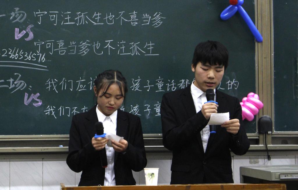 本次辩论赛表演赛分两场。第一场辩题是宁可注孤生也不喜当爹和宁可喜当爹也不注孤生,第二场辩题为我们应不应该告诉孩子童话都是骗人的。