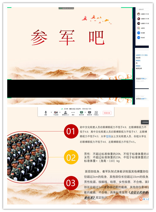 本次征兵宣传利用班会的形式,强化同学们服兵役的责任感和参军保卫祖国的意识,加强了同学们对部队军事的认识,充分调动同学们报名应征的积极性。会后,各年级辅导员和班主任将《2020征兵宣传四折页》,《大学生参军入伍指南》,《网上应征报名流程》等发给同学们,对同学们和家长们关注的身体条件,就业优势政策等问题进行了解答,鼓励同学们积极参军,保家卫国。