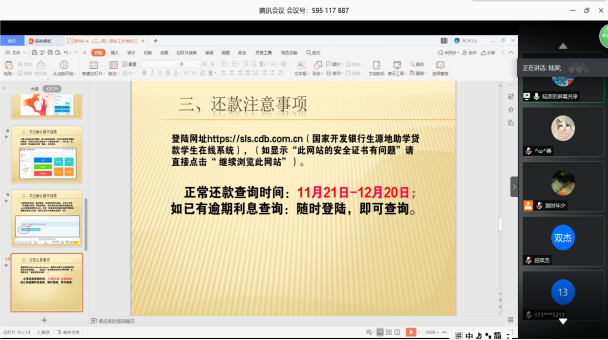 三年级与毕业年级开展诚信还款、诚信就业专题工作培训。通过集中培训深入宣讲生源地贷款还款流程、毕业生毕业确认等贷后管理工作。在生源地贷款还款培训会上,陆波老师结合开云官网学生贷款的实际情况,为同学们详解介绍了资助政策、毕业确定操作指南、还款注意事项、提前还款、个人信息变更和个人征信问题等具体事宜,并就采取何种方式还款、何时还款、诚信还款等给予了诸多建议并现场解答了部分学生提出的问题,让参会的每一位同学对生源地贷款还款的流程和注意事项有了更全面、更深刻的了解。