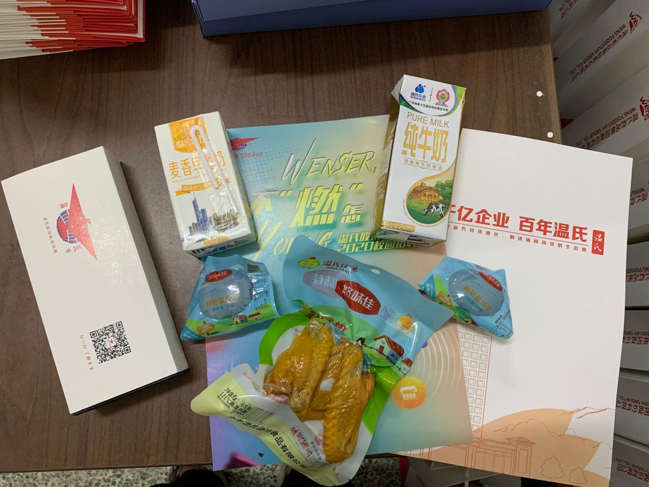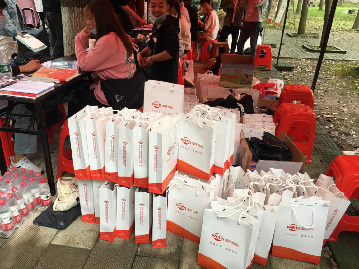 据了解今年动物科学学院2020级每一位报到学生都能领取到学院和企业共同为新生定制的“开学大礼包”,其中既有辅导员陆波老师为新生准备的现场报到程序单、校园卡使用指南、2020级新生入学手册等,还有“温氏集团”为新生制作的专用手提袋,里面有牛奶、鸡蛋、鸡翅等熟食,也有印制企业寄语的钢笔,这些小礼品都是采用线上个性化定制,每一样都体现了专业特色,又具有实用性,新生们拿到大礼包时,他们的入学之旅就开始了。