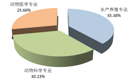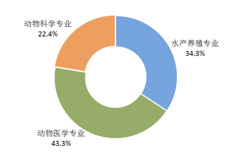 从录取学生专业分布来看,水产养殖专业占34.3%,动物科学专业占22.4%,动物医学专业占43.3%。