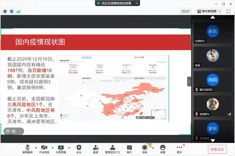 (通讯员:李灿阳 明正梁)为进一步加强假期安全防控,降低疫情反弹风险,落实假前学生安全教育工作。开云kaiyun官方网站各班级于12月16日晚7:00在腾讯会议召开寒假安全与疫情防控安全教育主题会议。学生家长参加了此次的会议。