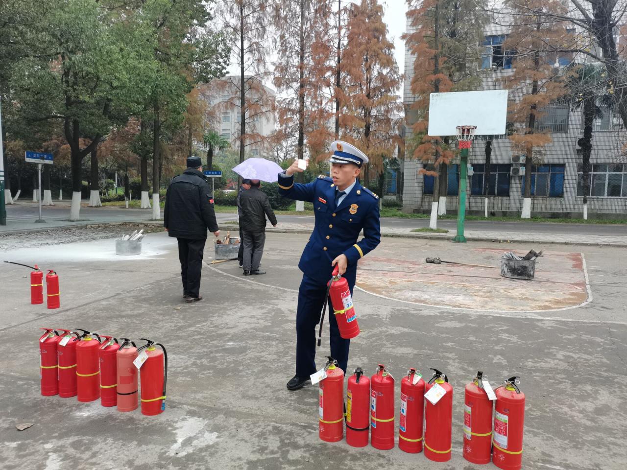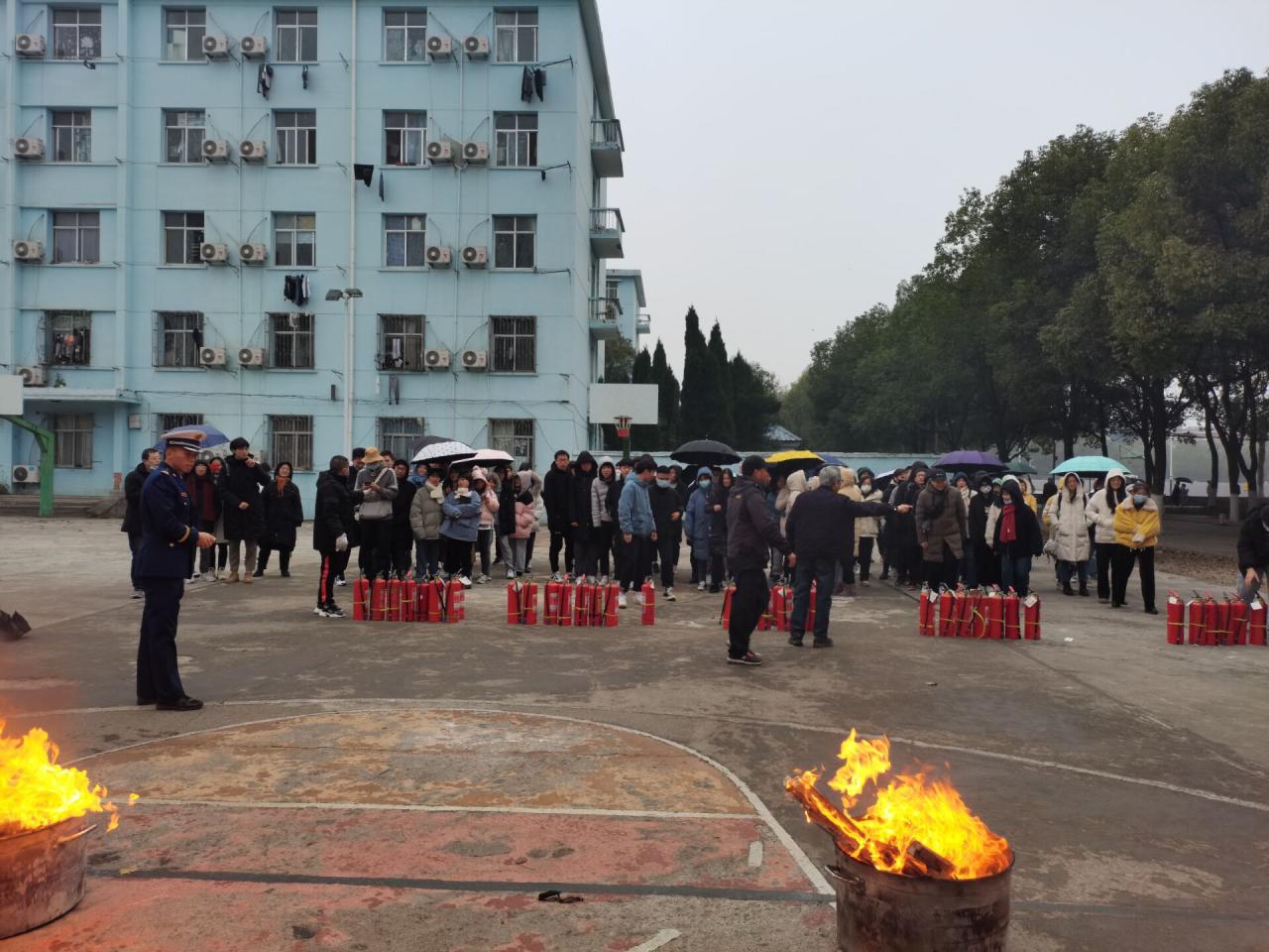 最后,苏晓云书记总结讲话。她首先表达了对张鼎站长的感谢,强调了之前宿舍检查时所发现的消防隐患,希望同学们及时整改到位。而后全体参会人员前往一号学生宿舍楼旁小篮球场进行消防安全演练。演练的目的是为了让同学们通过亲自使用灭火器扑灭火源的方式,真正学会灭火器的实际操作方法。