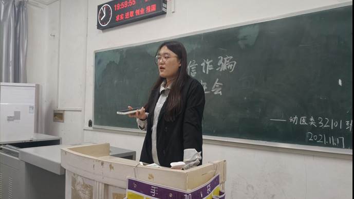 本次班会采取班级同学分享身边真实存在的诈骗故事的形式举办。各班同学积极准备,班会上积极发言。例如:动医32101班长介绍我校东校区同学受骗经历,网上购物被骗、盗号诈骗、刷单被骗等等。动医32103班同学积极参与分享身边诈骗案例,积极互动。动科职32101班长通过分享亲身经历的防诈骗故事,并结合所学知识电信诈骗进行简单总结:只要谈及银行卡、中奖,一律挂掉;只要一谈到“电话转接任何执法机构”的,一律挂掉;让同学点击链接的,一律删掉;一提及“安全账户”的,一律是诈骗。各班同学聚精会神,认真学习和听讲本次班会。