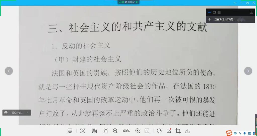 在正式学习之前,范海璐会放映不同的红色视频,加深同学们对党百年艰苦奋斗的认识。她先带领大家系统地学习《共产党宣言》,详细地阐述每章的核心内容及主旨含义,再由每位同学依次通过朗读的方式,对所学内容有更深刻的印象和更进一步的理解。在自由讨论环节时,同学们对书中不理解的地方提出了疑问并相互交流,分享了另自己感触最深的句子并发表心得体会。这不仅增加了课堂的趣味性,同时最大程度地调动了大家的学习热情与积极性。