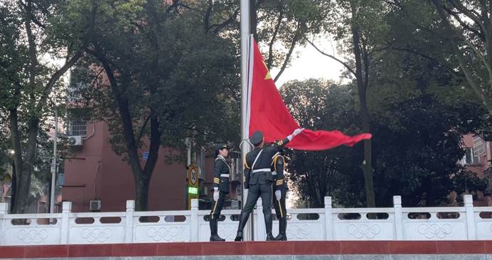7点整,迎着初升的太阳,升旗仪式准时开始,仪仗队队员迈着矫健的步伐护卫五星红旗入场。当雄壮有力的国歌奏响,国旗冉冉升起,全体师生行注目礼,气氛庄严肃穆。