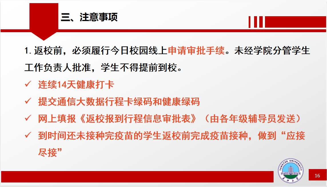 会议伊始,杨湘虹老师给同学们讲了开学的时间安排和新生入学以及老生返校所需准备材料。紧接着,杨湘虹老师就关于疫情防控对同学们讲解了返校安全须知,她指出:部分同学处于风险地区,目前严令禁止返校。最后,杨湘虹老师提出返校中的注意事项:一是严格按照要求,做到每日健康打卡并汇报自己的健康状况;二是注意返校途中的自我保护,做好疫情防控的同时对自身的安全以及财务高度重视。