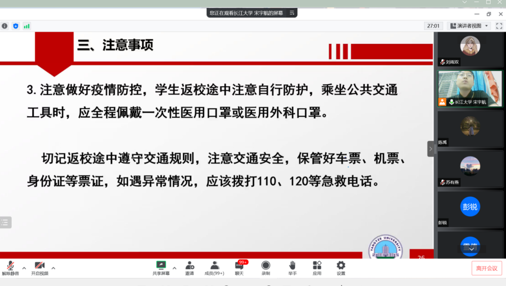 会议中,宋宇航对返校前的准备和返校流程进行了详细解读,会议强调每日健康打卡、返校申请和新冠疫苗接种需严格按照学校要求执行,全体学生要提高自我安全防范意识。同时,宋宇航还强调要做好疫情防控和保护好自己的生命安全与贵重物品,建议新生们不要携带大量现金,谨防上当受骗。