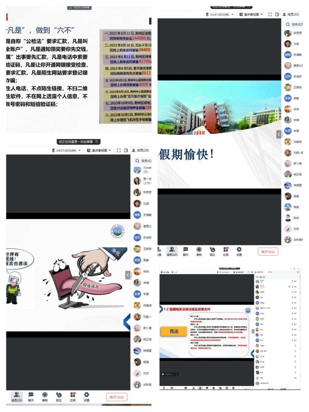 五一假期将至,为确保研究生度过一个安全、愉快的假期,按照研工部、学院部署,研究生以班级为单位通过线上线下相结合的方式开展了安全教育主题班会。 此次班会内容丰富,涉及交通安全、食品安全、网络安全等多个方面,通过案例分析和专家讲解视频,让同学们深刻认识到安全的重要性。研究生辅导员王婷特别强调了假期期间的安全注意事项,提醒同学们遵守法律法规,注意个人财物安全。 此次线上安全教育主题班会的开展,有效提升了同学们的安全意识和自我保护能力,为营造平安和谐的校园环境奠定了坚实基础。 (审核 苏应兵|编辑 罗婧雪 王婷)