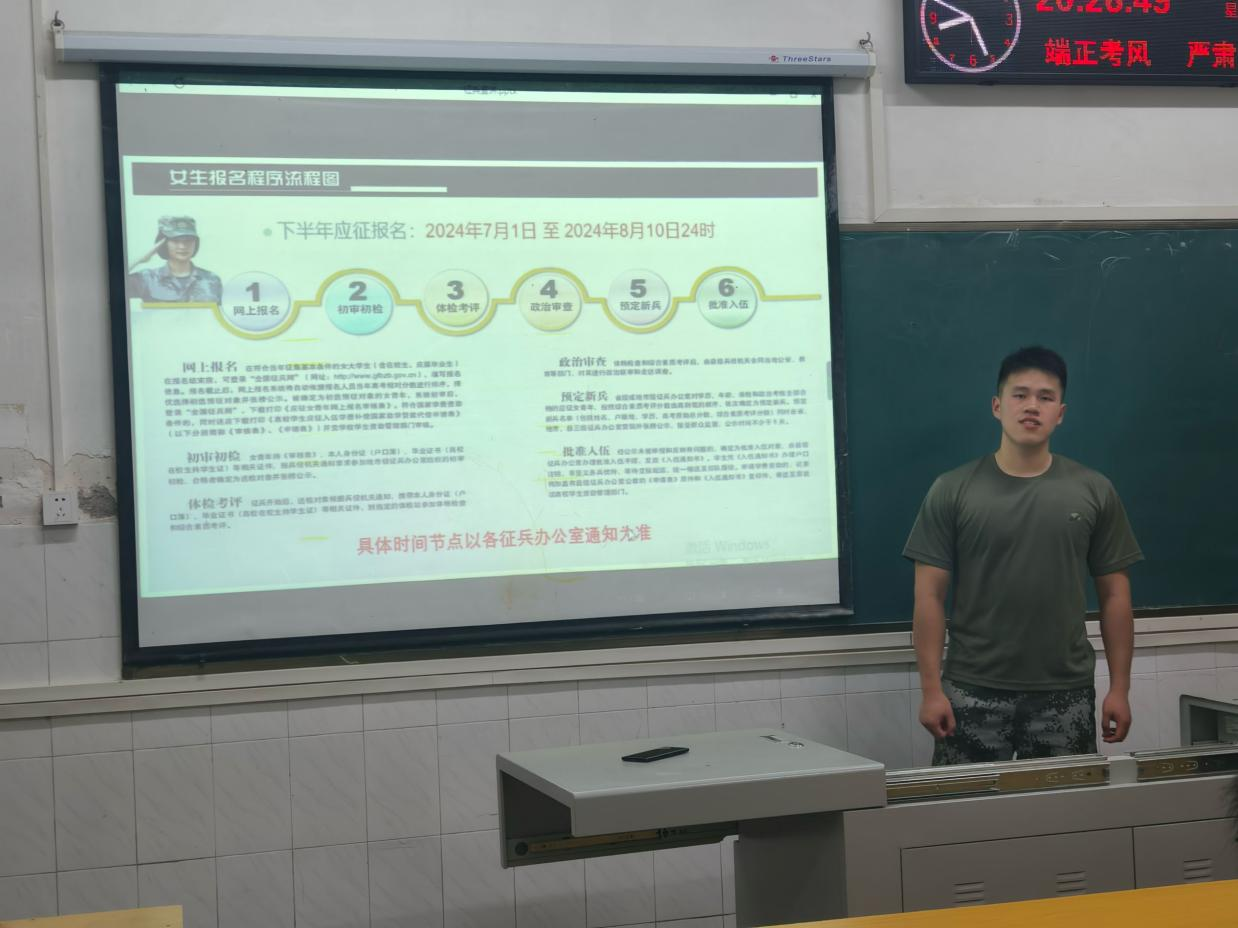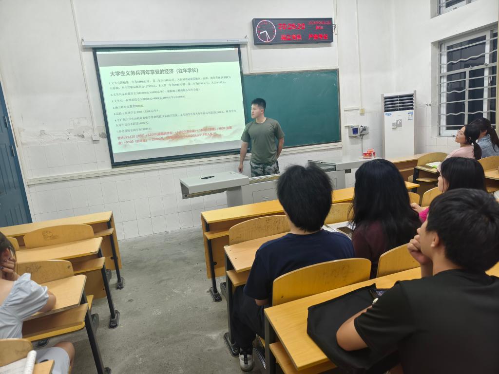 为了积极响应国家征兵号召,鼓励更多优秀的大学生投身国防事业,6月12日晚,一场别开生面的征兵宣讲活动正式拉开帷幕。本次宣讲会由开云kaiyun官方网站征兵专干宋宇航老师主持,退役大学生郑一成作为宣讲员进行宣讲。