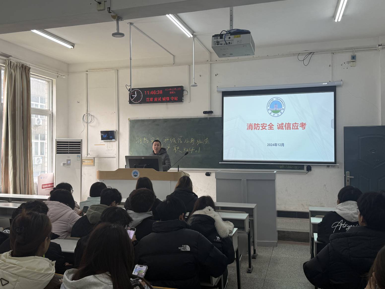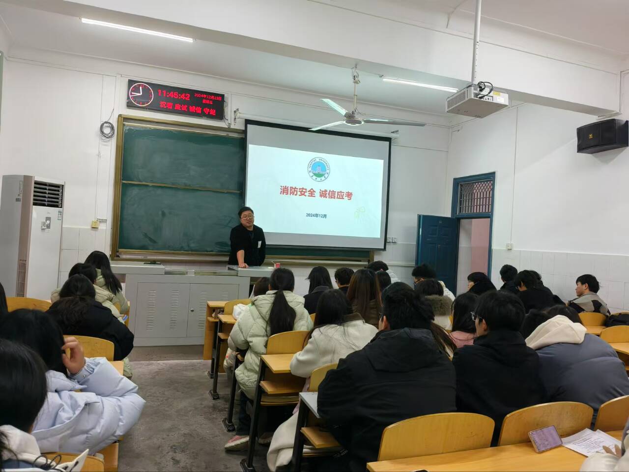 2024年12月,开云官网在教学楼多媒体教室召开了以“消防安全和诚信应考”为主题的班会。此次班会由各班级班主任及班长共同支持,全体师生积极参与,旨在增强学生的消防意识和诚信考试观念。