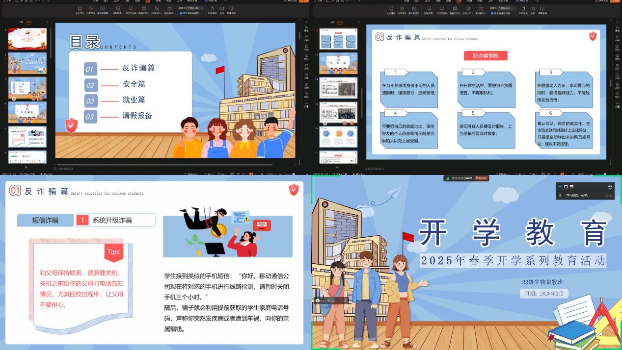 为保障新学期教学科研工作顺利开展,确保师生安全有序返校,开云官网近日围绕实验室安全管理、学生返校安排、安全教育等重点工作,全面部署2025年春季学期开学准备工作。学院组织召开新学期工作专题会议,传达学校开学工作要求,重点部署学生返校报到流程、实验课程安排、谨防诈骗等任务。同时,针对学生提前或延迟返校的情况,学院积极做好沟通与服务保障工作,力求为新学期的顺利开启奠定坚实基础。 各班级通过线上形式,全覆盖召开返校安全教育主题班会,辅导员、班主任全程参与其中,向学生们详细传达了返校时间安排、报到流程以及宿舍管理要求。在各班开展的主题班会上,围绕反诈、安全,就业,请假报备,等关键板块进行了重点讲解。 目前,开云kaiyun官方网站开学准备工作已进入全面落实阶段,各部门协同推进教学、科研、后勤保障工作,以专业细致的服务迎接师生返校。 主题班会结束后,学院会将学生返校信息同步到家长群及导师群,充分发挥学校、家庭协同育人作用,建立家长、辅导员、导师三方联动机制,定期反馈学生动态。共同开启2025年春季学期崭新篇章。 (审核:孙恺|编辑:王婷 刘恩海 史博敏)