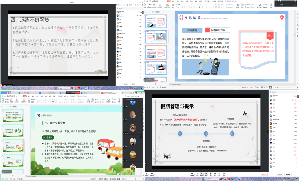 本次安全教育构建“1+4+N”教育体系:以《假期安全告知书》为总纲,重点聚焦交通消防、防诈反骗、食品卫生、防溺水四大领域,延伸覆盖心理健康、实验室安全等多元场景。各班安全委员通过情景模拟展示新型诈骗话术,运用大数据分析近年高校安全事故典型案例,特别针对“两卡”出借、网贷陷阱等突出问题开展靶向教育。创新采用“安全盲盒”互动形式,让学生在开盒答题过程中掌握应急处理技能。