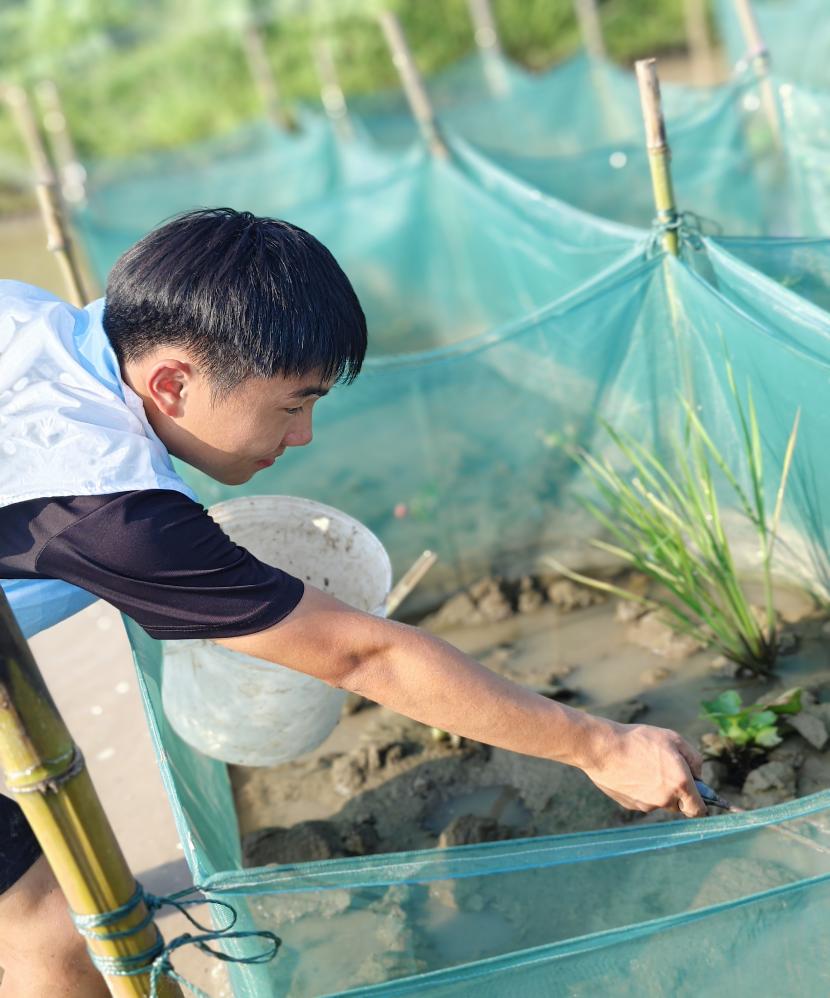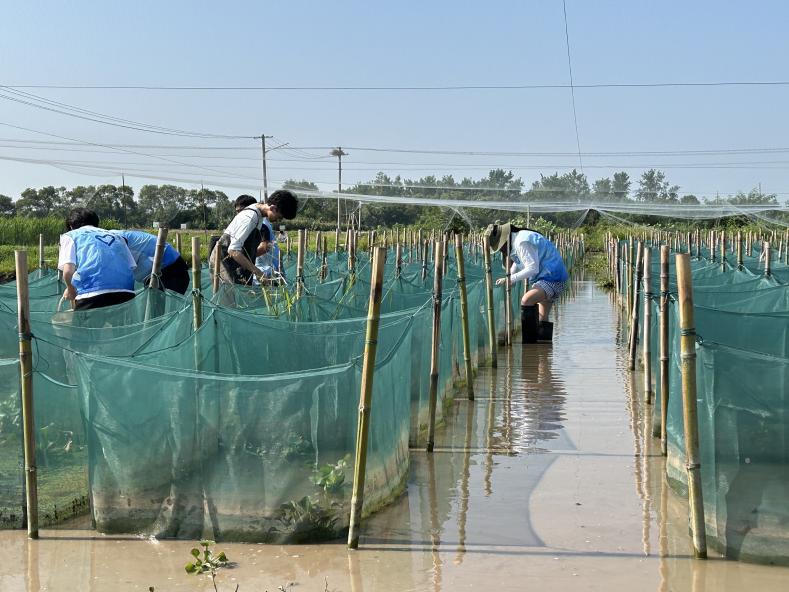 抵达实践地后,志愿者们迅速进入角色。穿好雨靴、拿好工具,踩着没过小腿的淤泥走进黄鳝养殖池,大家分工明确:有的专注打捞水底的成螺,有的仔细清除岸边附着的粉红色螺卵,有的负责将清理物集中装袋并进行无害化处理。高温天气下,淤泥散发的腥气混杂着汗水的味道,却丝毫没有影响志愿者们的节奏。大家手中的网兜一次次沉入水中,又满载着福寿螺被提起,手套上的泥浆早已凝固成块。