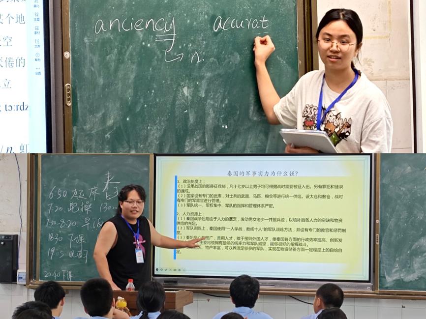 下午课程延续了上午的教学安排,军事理论课上志愿者谢方哲的独到讲解引起了同学们对军事理论和国际局势的莫大兴趣 ,增强了爱国意识,滋润了同学们心中大局观的幼苗。此外,美术课在志愿者老师常瑞融的带领下,上演了一幕全员齐创的生动画卷,通过在黑板上合作绘画的方式,不仅调动起学生的学习热情,还增强了团队凝聚力,同时也拉近了志愿者们与学生们的距离。