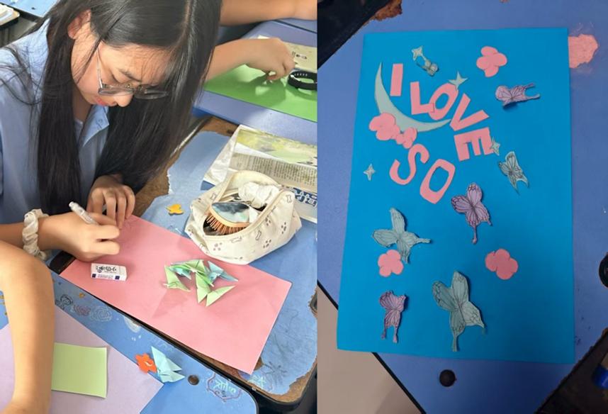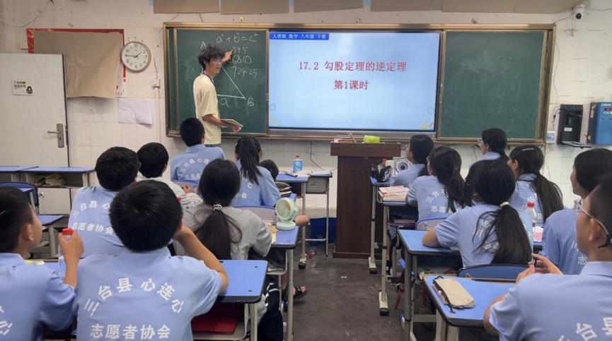 七年级学生们开展了对传统乐器的鉴赏学习,志愿者老师陈旸精心准备课件,通过文字提示与音乐片段中快速地进入艺术的氛围。传统乐器的乐声下,学生们仿佛穿越千年,陶醉于艺术文化长河。与此同时,八年级学生们在三角形模型的导入下,开始了勾股定理的逆定理的学习,志愿者老师李佩烜筹备已久的课堂更是扩展了有关三角形的更多知识,丰富了学生的知识面,对知识有了更深层次的理解。短暂休息之后,教室里传来朗朗读书声,原来是志愿者老师贵玲在教授《醉翁亭记》,无论是在生僻字词的纠音纠错上,还是对文字背后内容的深度解读里,无不体现志愿者和同学们的双向奔赴。此外,学生们还在志愿者老师杜韵希的指导下鉴赏了“会飞的花朵”—蝴蝶,并绘画且制作了美丽的蝴蝶折纸。