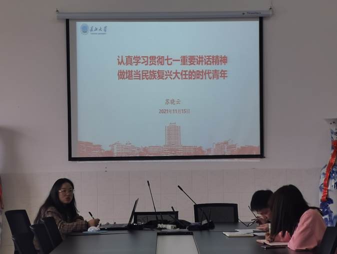 (通讯员:邓翰源 尧志轶|摄影 范海璐)岁月峥嵘,不忘初心。为深入学习贯彻习近平总书记“七一”重要讲话精神,11月15日学院党委副书记苏晓云以《认真学习贯彻七一重要讲话精神 做堪当民族复兴大任的时代青年》为题,在五教1005会议室为学生会同学讲党史学习教育专题党课。