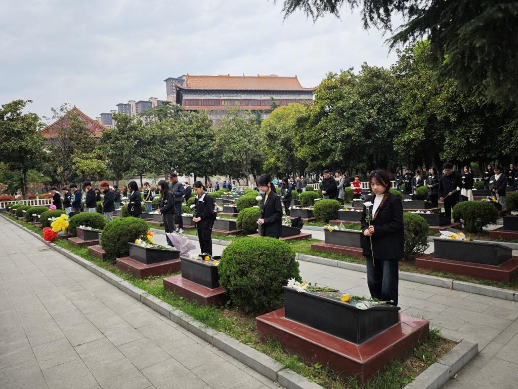 仪式结束后,师生们缓缓步入墓园。他们小心翼翼地为每一位烈士擦拭墓碑,轻轻拂去岁月的痕迹,让墓碑上的文字重新清晰醒目。随后,大家庄重地三鞠躬,并将手中的菊花轻轻摆放,以最诚挚的方式向先烈们表达最崇高的敬意与无尽的追思。